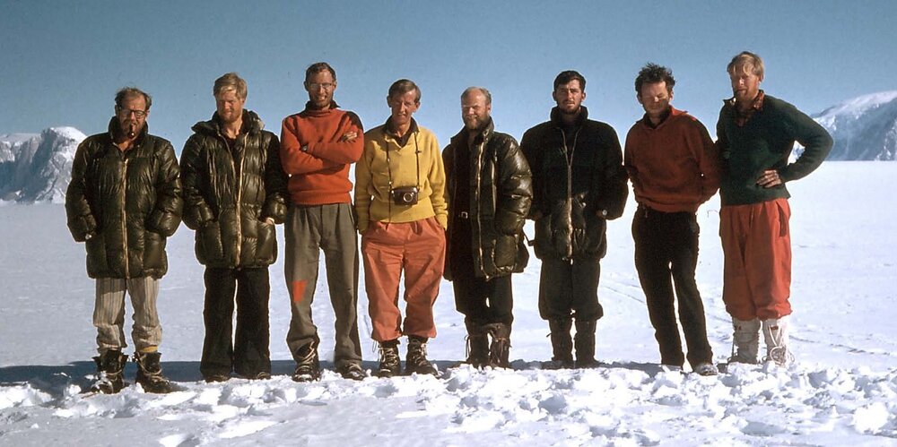 L-R R L Oliver (Geologist), C N Cooper, (Surveyor). R W Cawley (Leader), M R Bolt (Field Assistant and radio operator), M R Bolt (Surveyor), B J McGlinchy (Field Assistant), B L Smith (Field Assistant), C H Tyndale-Biscoe (Deputy Leader and naturalist).