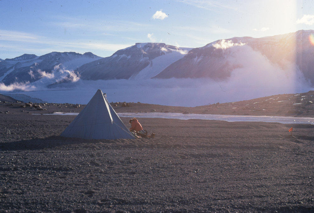 DescriptionPearse Valley- Midnight sun on camp by Lake SigridSeason1972-1973Date TakenBetween 1st November 1972 and 30th November 1972OriginalSlideNo. People1LocationPearse ValleyGeolocation[1] Position