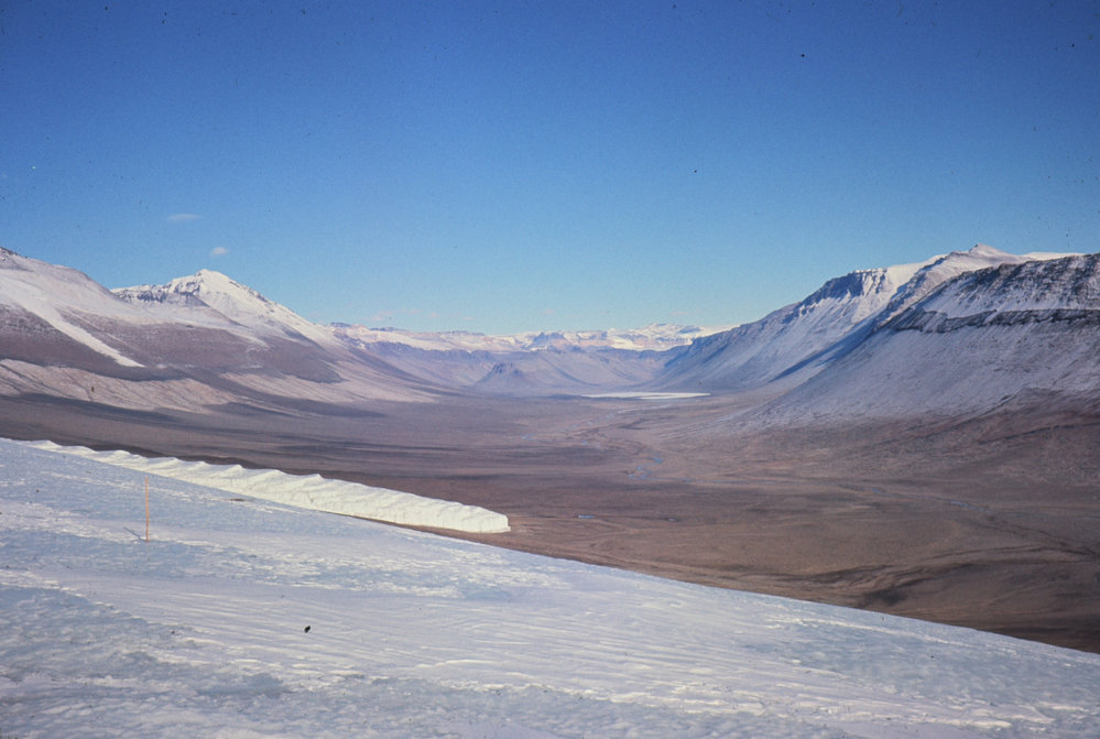DescriptionStanding on a Glacier looking west towards Lake Vanda in the Wright ValleyPhotographerJim BarkerSeason1971-1972Date Taken1971-1972 SeasonOriginalSlideLocationWright ValleyGeolocation[1] Position