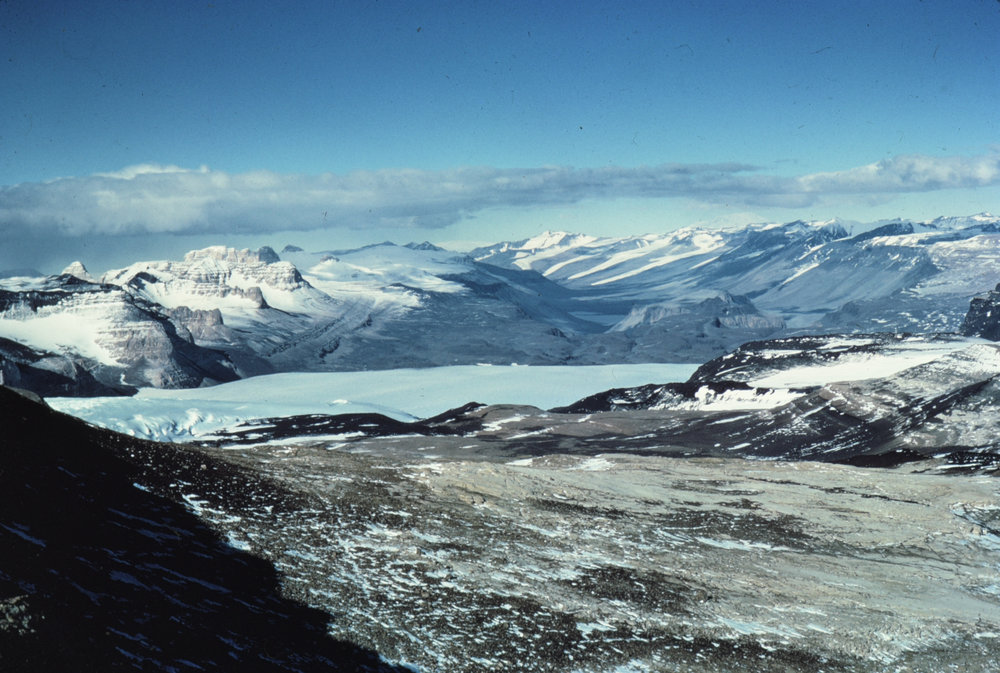 DescriptionView to East from Ridge Summit of Mount Fleming look into Wright Valley. Lake Vanda visibke. Airdevronsix icefall to left Upper Wright Glacier. Mount Erebus in distancePhotographerK LefeverDate Taken1973-01-07OriginalSlideLocationRidge SummitGeolocation[1] Position