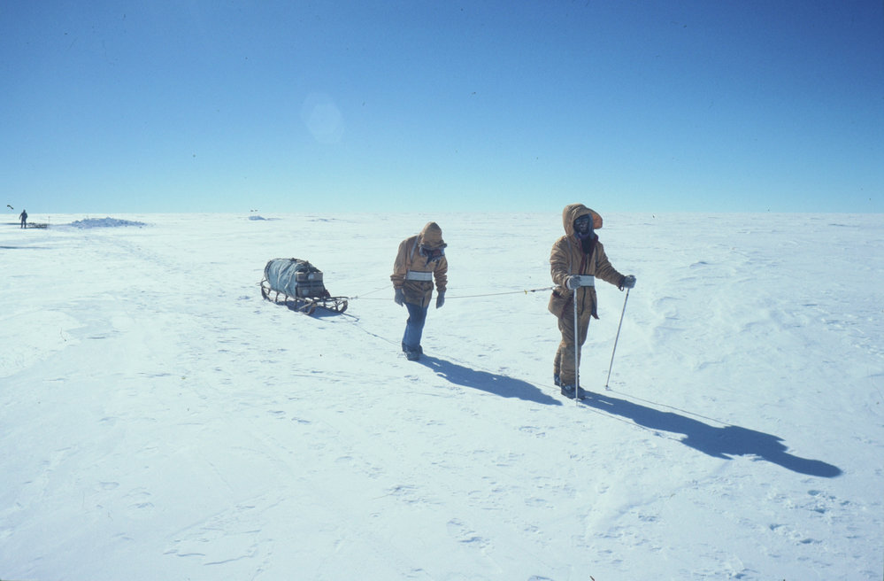 D Wylie and J Gee manhauling equipment from the C130 depot to the camp site on the East Antarctic Plateau. Antarctica NZ, accessed 16/04/2026, https://adam.antarcticanz.govt.nz/nodes/view/8088