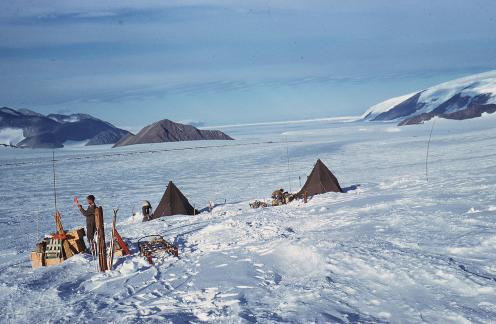 DescriptionLooking down to Hallet Station from Football Base CampPhotographerArnold J HeineSeason1957-1958Date Taken1957-1958 SeasonOriginalSlideNo. People1LocationFootball MountainGeolocation[1] Position