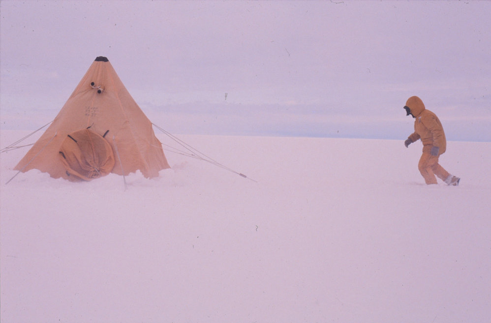 DescriptionNZAP returning to polar tent in windPhotographerKim WesterskovSeason1991-1992Date Taken1991-1992 SeasonOriginalSlideNo. People1LocationRoss Ice ShelfGeolocation[1] Position