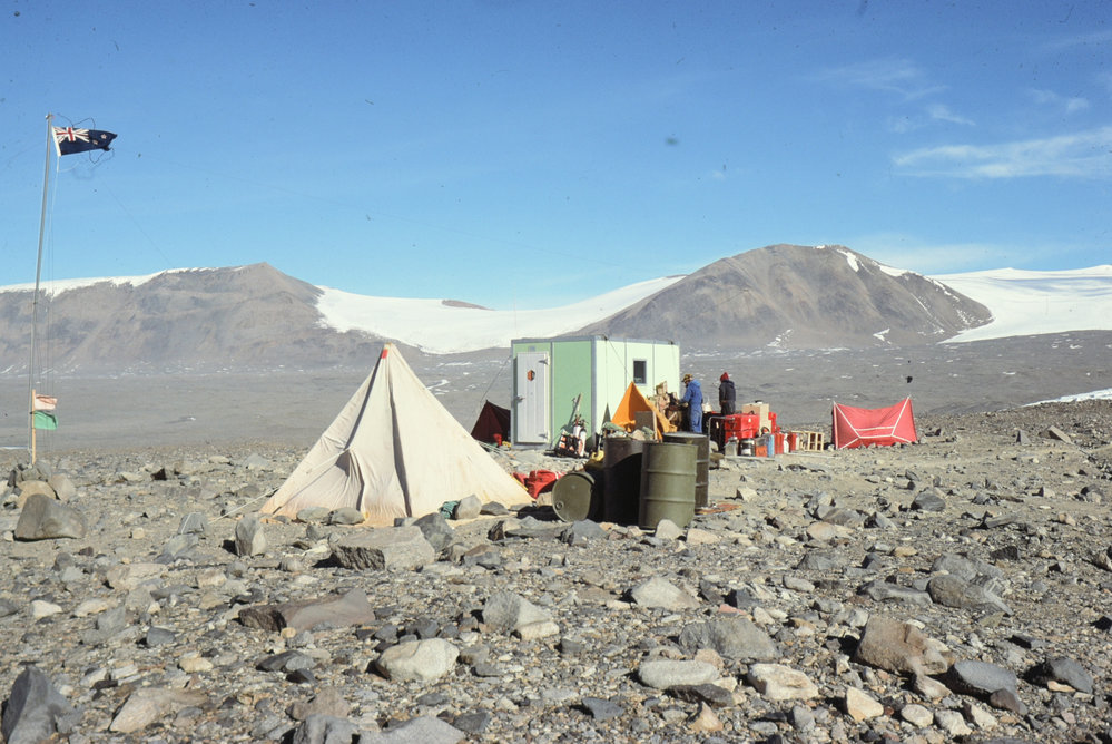DescriptionHut & Flagpole - Lake FryxellPhotographerNigel S RobertsSeason1979-1980Date Taken1979-1980 SeasonOriginalSlideNo. People2-5LocationLake FryxellGeolocation[1] Position