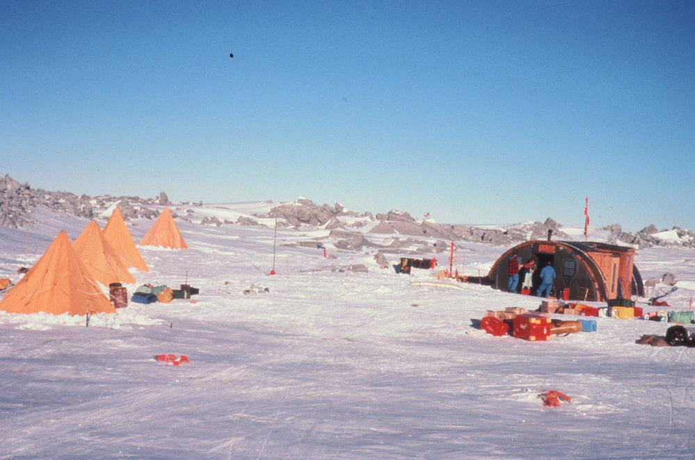 DescriptionCamp at Lower Erebus Hut.PhotographerMaryanne WatersSeason1989-1990Date TakenBetween 1st December 1989 and 31st December 1989OriginalSlideNo. People2-5LocationMount ErebusGeolocation[1] Position