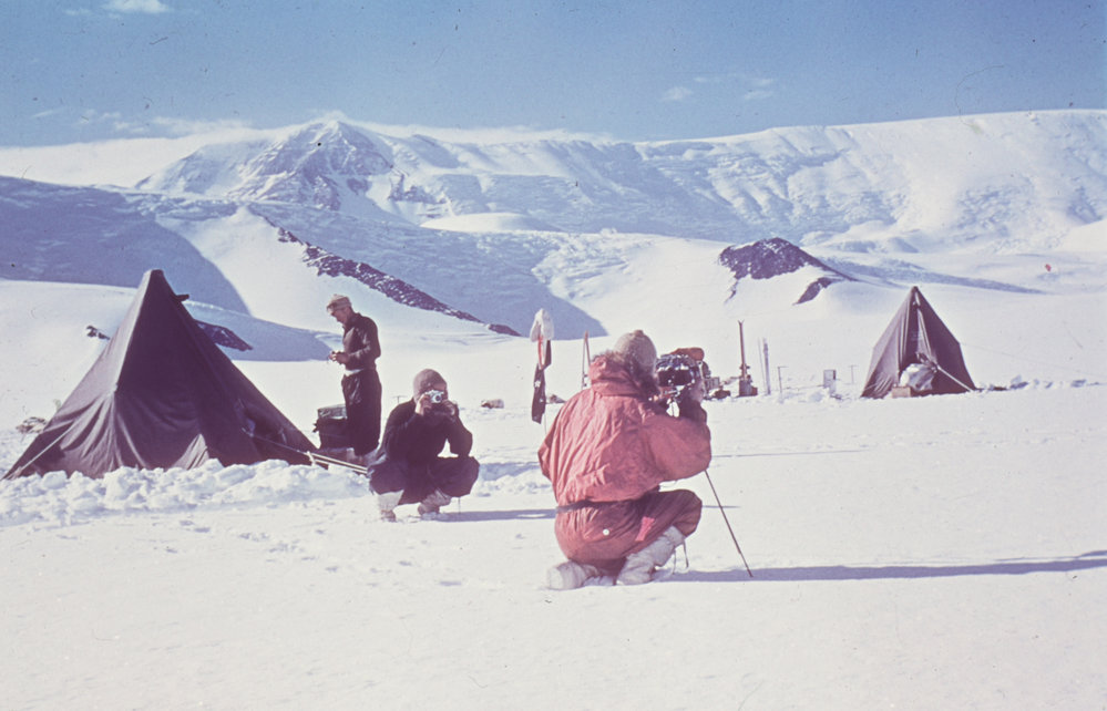 DescriptionAt Foot of Mount Lloyd Escarpment - good weather for photography on Lowery Glacier. Walcott, Matterson, Wise.DepictsK WiseGarth Matterson PhotographerP HuntSeason1959-1960Date Taken1959-1960 SeasonOriginalSlideNo. People2-5LocationLowery GlacierGeolocation[1] Position