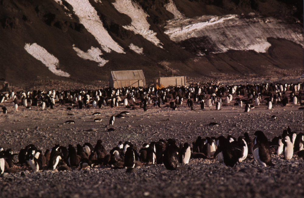 Borchgrevink Huts Surrounded by Penguins. Historic Huts, Cape Adare - Exterior