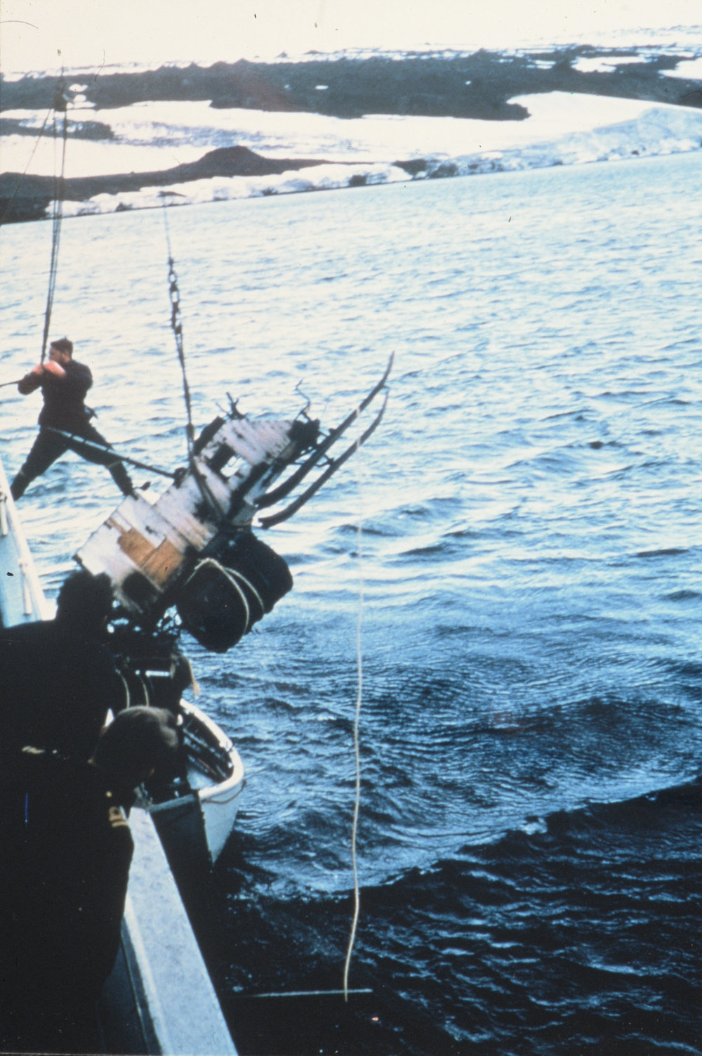 DescriptionLoading historic tractor from Scott's Terra Nova Expedition on the Endeavour by Cape Evans.PhotographerF DavidsonSeason1957-1958Date Taken1957-1958 SeasonOriginalSlideNo. People1LocationRoss SeaGeolocation[1] Position