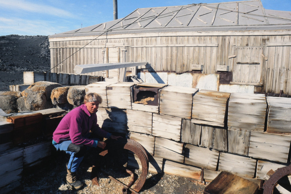 DescriptionShackleton's Hut Garages and Stables Area.DepictsBrendan HaighPhotographerCath GilmourSeason1990-1991Date Taken1990-1991 SeasonOriginalSlideNo. People1LocationCape RoydsGeolocation[1] Position