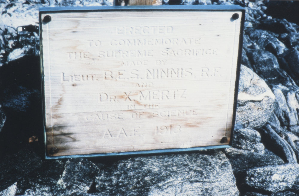 DescriptionCape Denison Memorial Plaque. Ninnis and Mertz.PhotographerB AhernSeason1981-1982Date TakenBetween 1st December 1981 and 31st December 1981OriginalSlideLocationCape DenisonGeolocation[1] Position